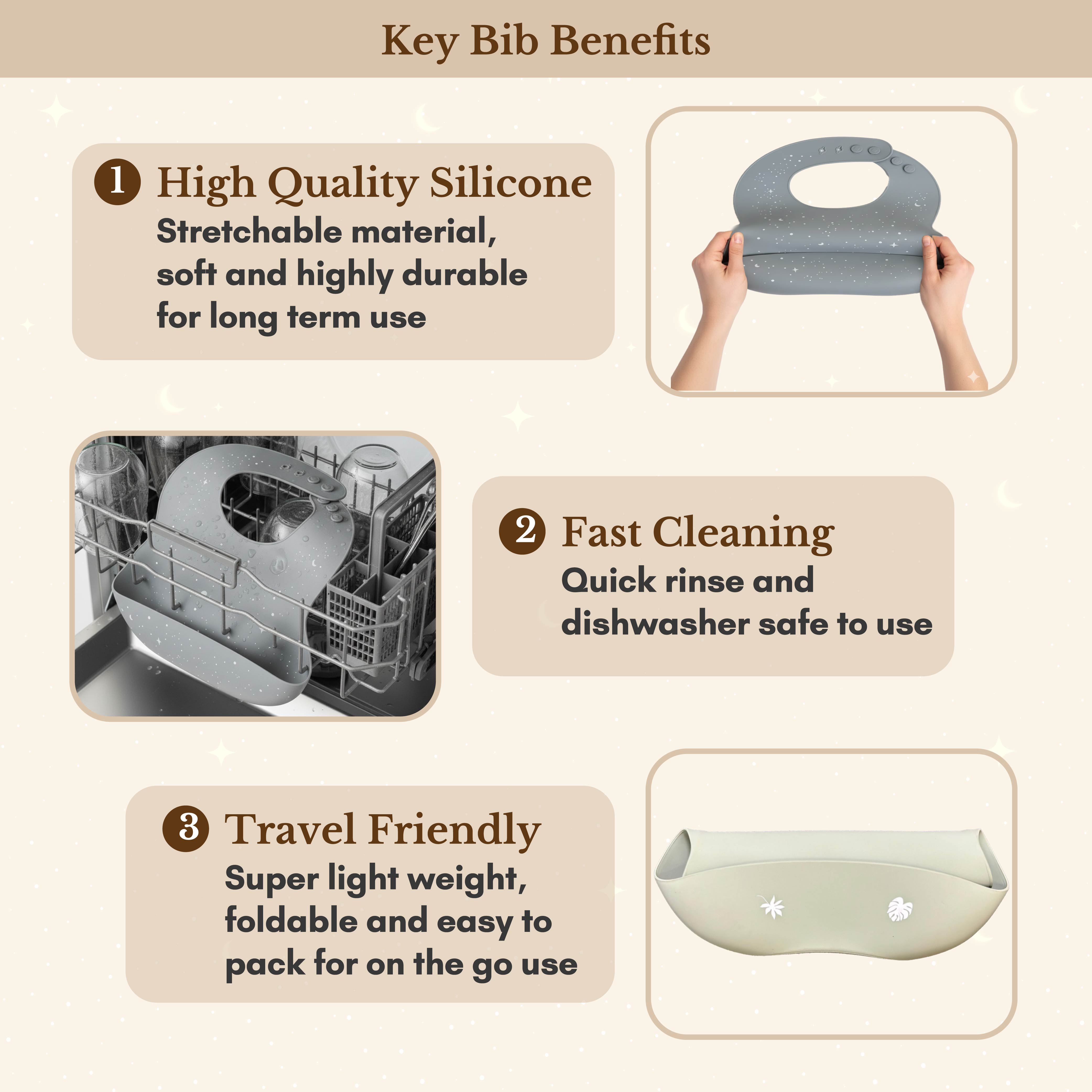 Milk It Baby Silicone Bibs are designed to add style and aesthetic to meal times. Our 100% food grade silicone bibs come in a variety of muted colours and print pattern designs. Less time spent worrying about messy meals and burp cloths means more time for cute feeding fun! The spill pockets are rigid in shape and holds all the messy drools and dribbles! Soft to the touch, the bib is also equipped with an adjustable neckband to for your growing child. The bibs are wipe clean and super easy to wash in a dishwasher. The perfect and most effortless solution for back to back meals. Suitable for infants from 4 months up.
