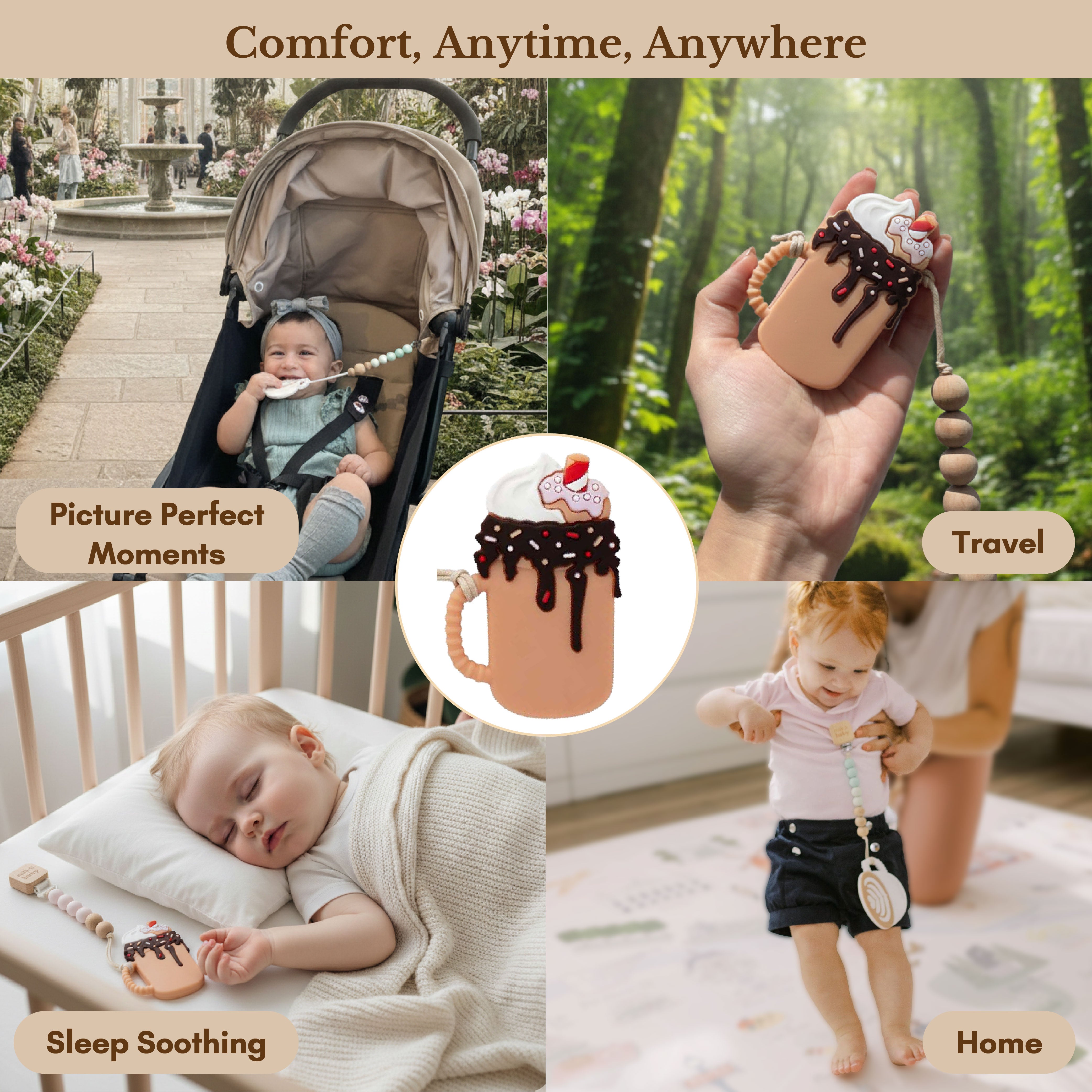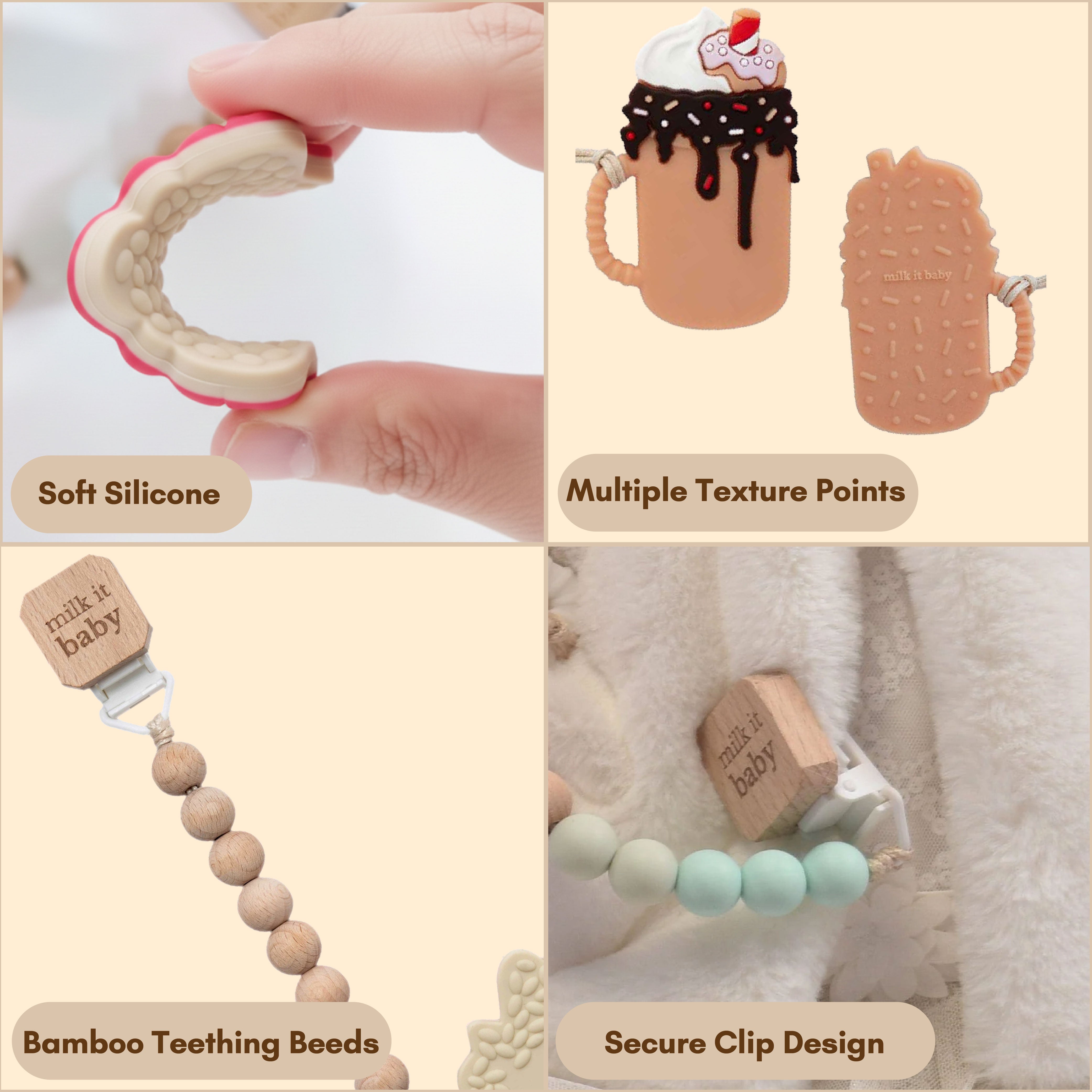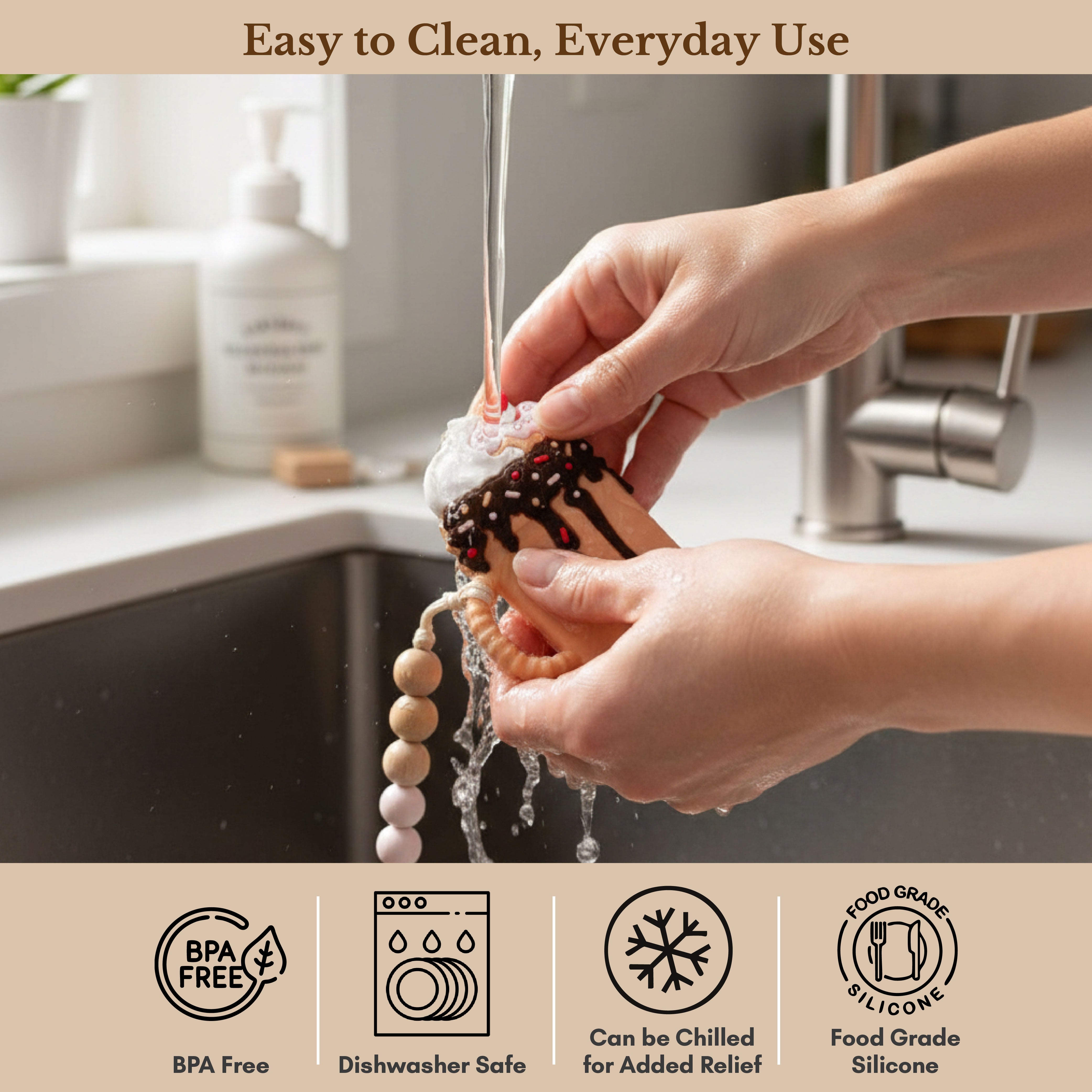 Extra sprinkles please! Made of food grade silicone, our monster milkshake teether offers sweet relief for teething babies, with engaging and raised sprinkle textures on both sides. It can even be stored in the refrigerator for a few hours before offering it to your baby for extra comfort! Also available in strawberry colours.