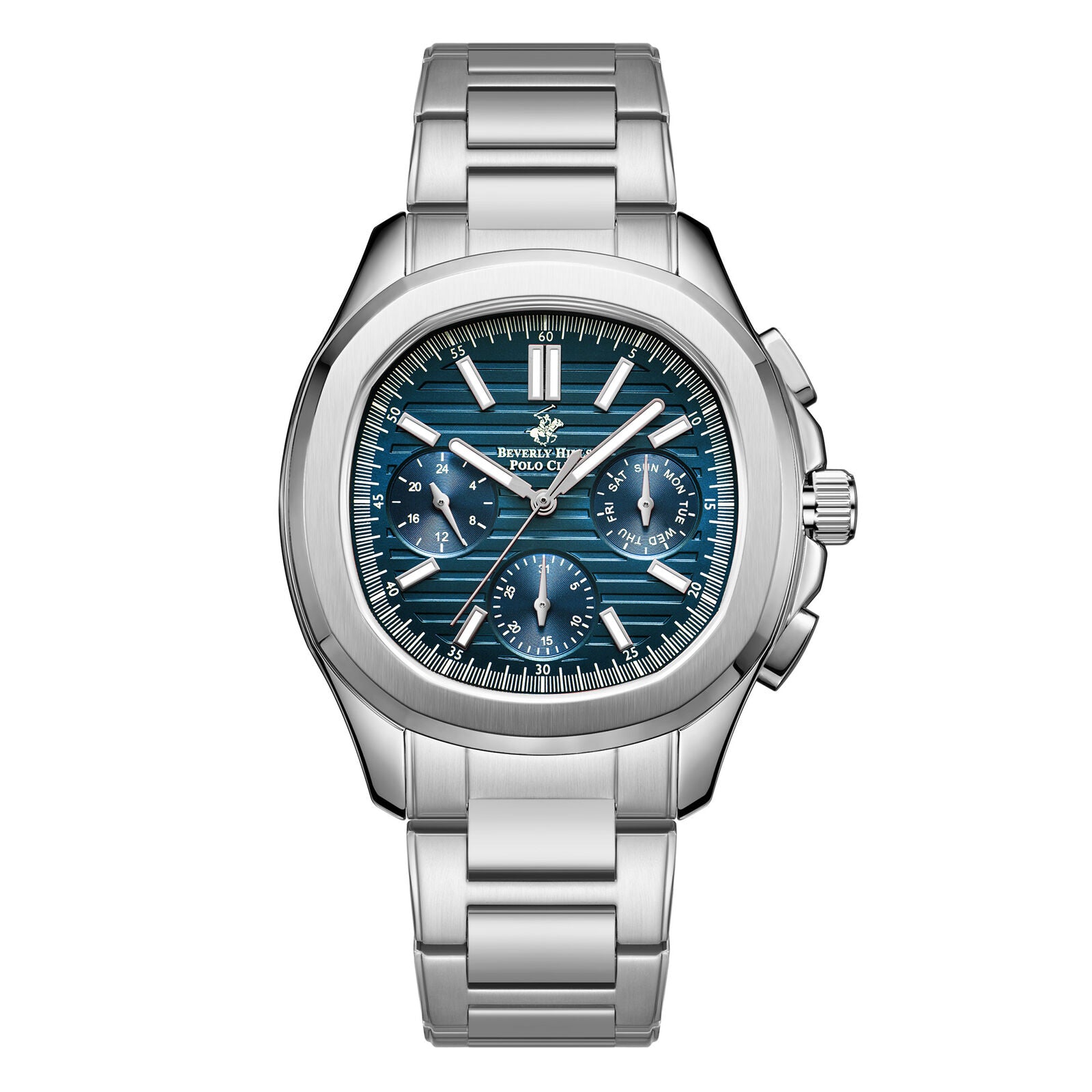 Beverly Hills Polo Club Men's Analog Watch, Dark Blue Dial Multi-Function With Silver Stainless Steel Band, BP3212X.392