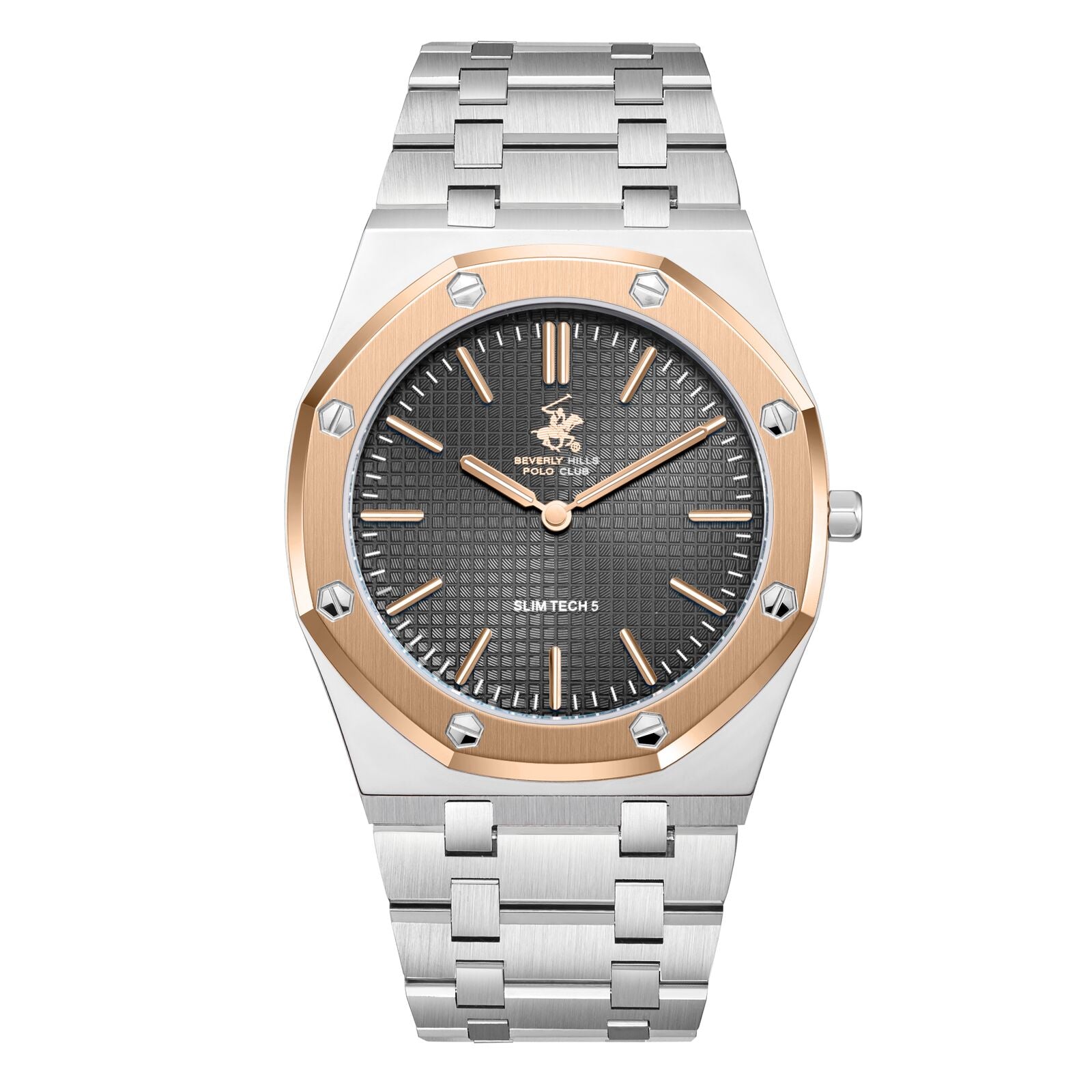 Beverly Hills Polo Club Men's Slim Analog Watch, Gun Dial With Silver Metal Band, BP3825X.560
