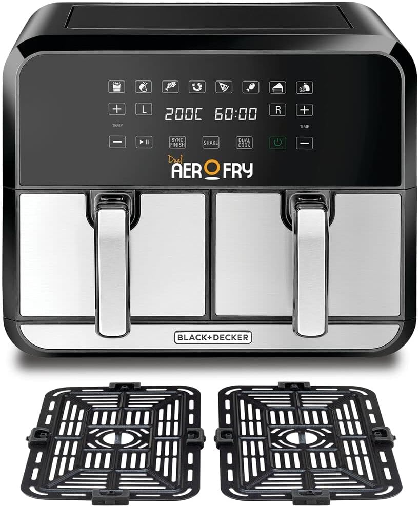 Black+Decker DZAF1700 Digital Dual Zone Air Fryer with 8L capacity, 1700W power, and touchscreen. Cook two meals at once with air fry, bake, grill, and roast functions.