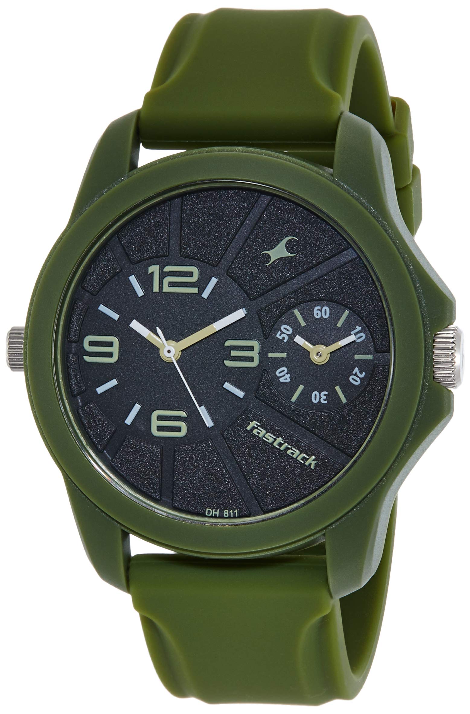 Fastrack, Men's Analog Dual Time Watch, Black Dial Green Rubber Strap, 38042PP02