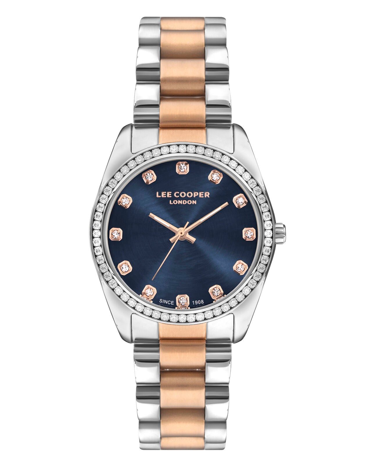 Lee Cooper Women's Analog Watch LC07478.590 with a dark blue dial and two-toned rose gold metal band, combining sophistication and modern style.