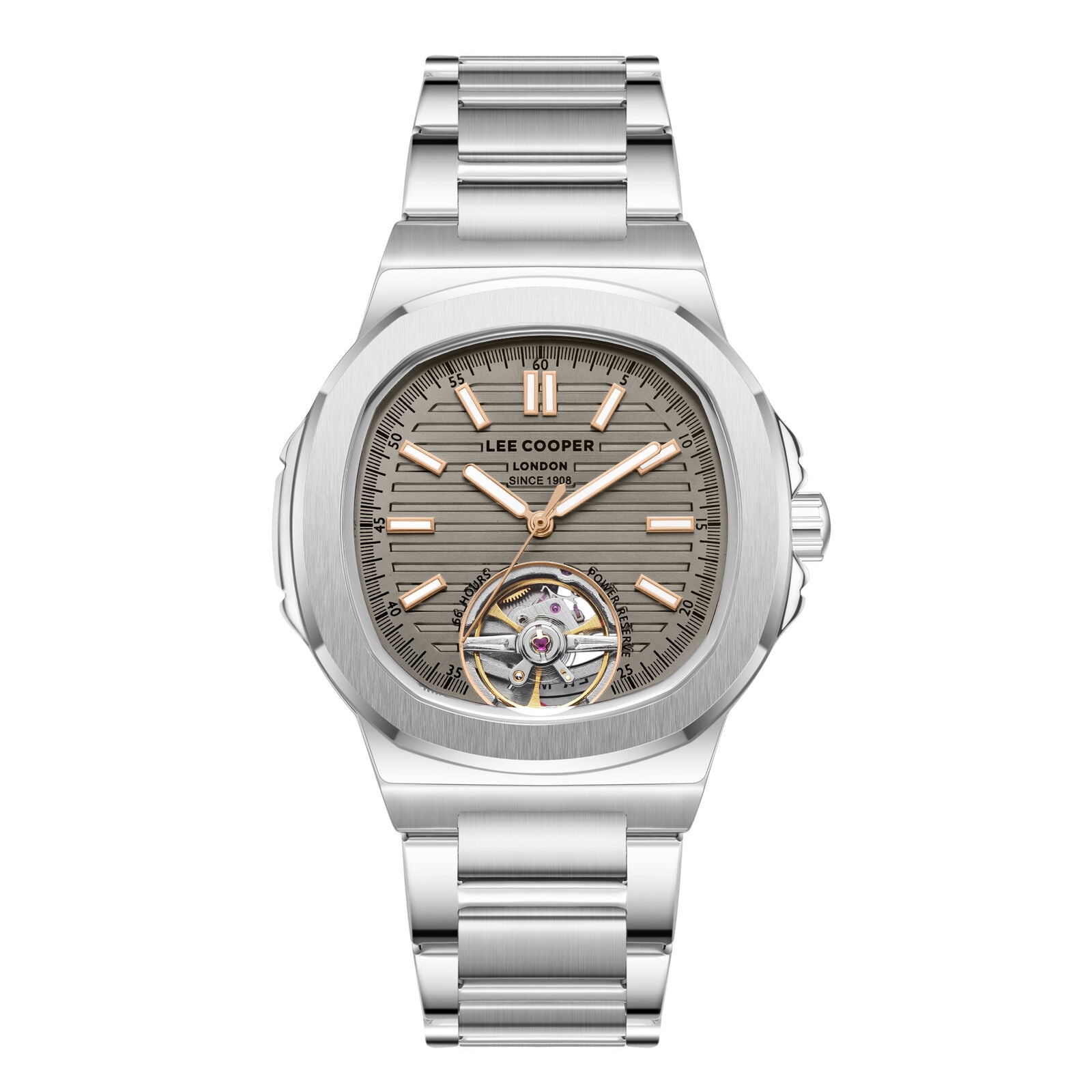 Lee Cooper Men's Automatic Skeleton Watch LC08227.360 with beige dial and silver metal band. Stylish, precise, and powered by self-winding movement.