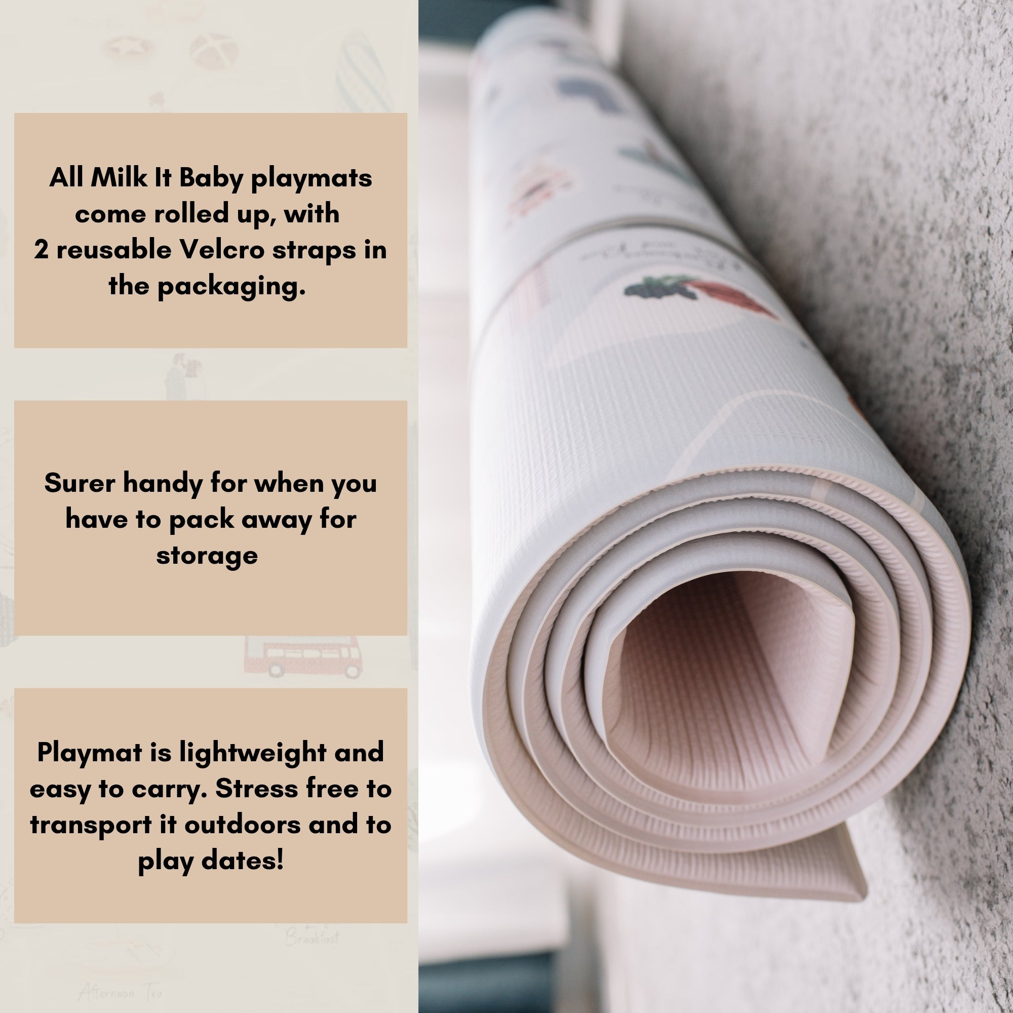 All Milk It Baby play mats come rolled up with 2 reusable Velcro straps in the packaging. This is very handy for when you have to roll them up again to clean, pack away or transport it outdoors and to play dates!