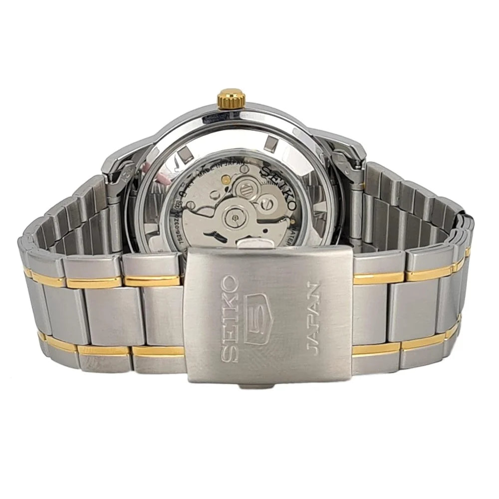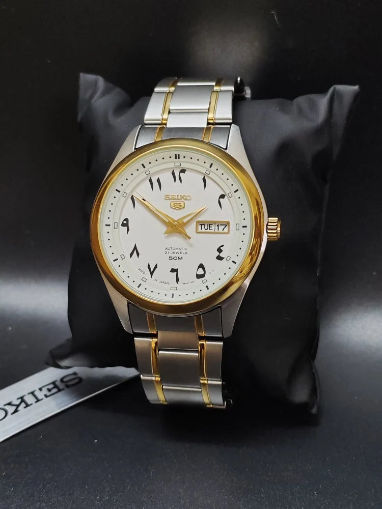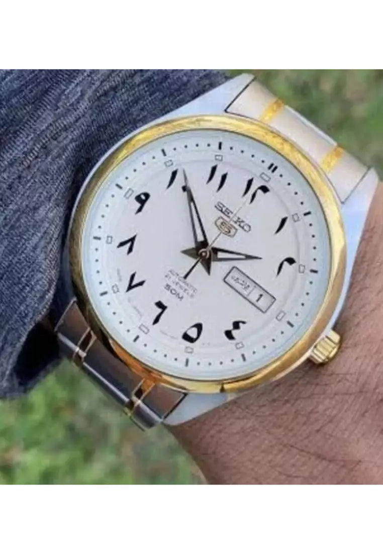 Seiko Men's Mechanical Watch, Arabic White Dial Silver Stainless Band, SNKP22J