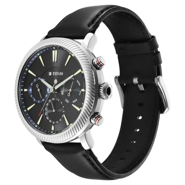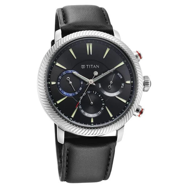 Titan Men's Multifunction Watch Black Dial With Black Leather Strap, 10012SL01