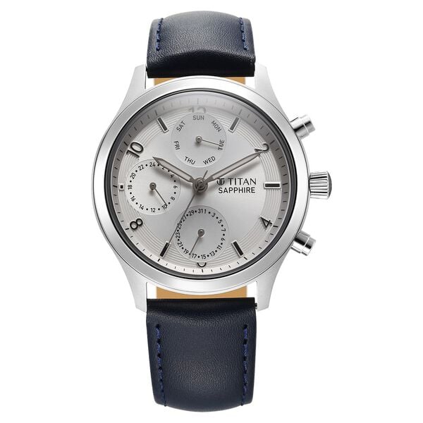 Titan Sapphire Men's Multifunction Watch Analog Silver Dial with Blue Leather Strap, 1874SL04