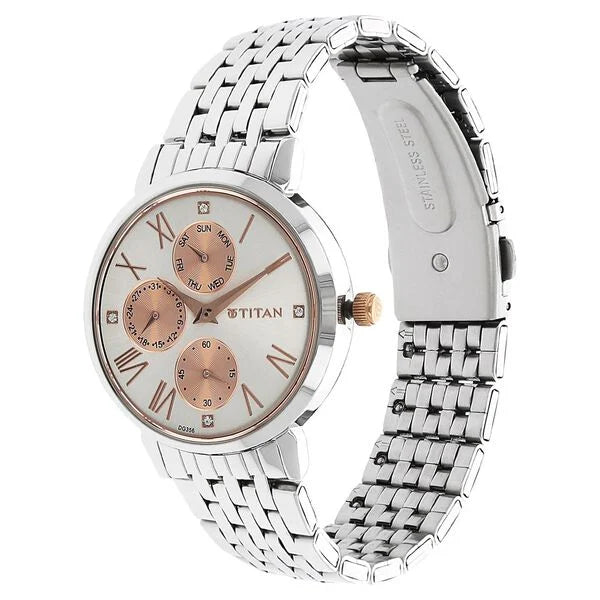 Titan Workwear Women's Watch Analog Rose Gold Dial With Silver Stainless Steel Band, 2569KM01