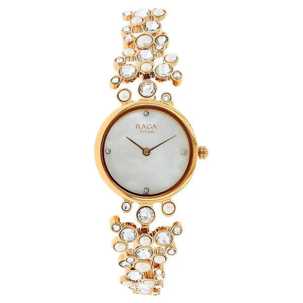 Titan Raga Women's Watch with Mother Pearl dial and Stone Studded Metal Strap, 95032WM01